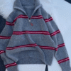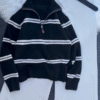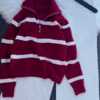 The top is a collared zip-up sweater in vibrant red with horizontal white stripes, crafted from a soft, medium-weight knit that offers warmth without bulk. The zip closure is accented with a pendant-style zipper pull, adding a touch of metallic contrast and visual interest. The collar gives it a structured edge, while the relaxed fit ensures comfort and layering versatility. Whether zipped up for a sleek look or worn open over a tank, the sweater brings personality and poise to any outfit.