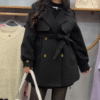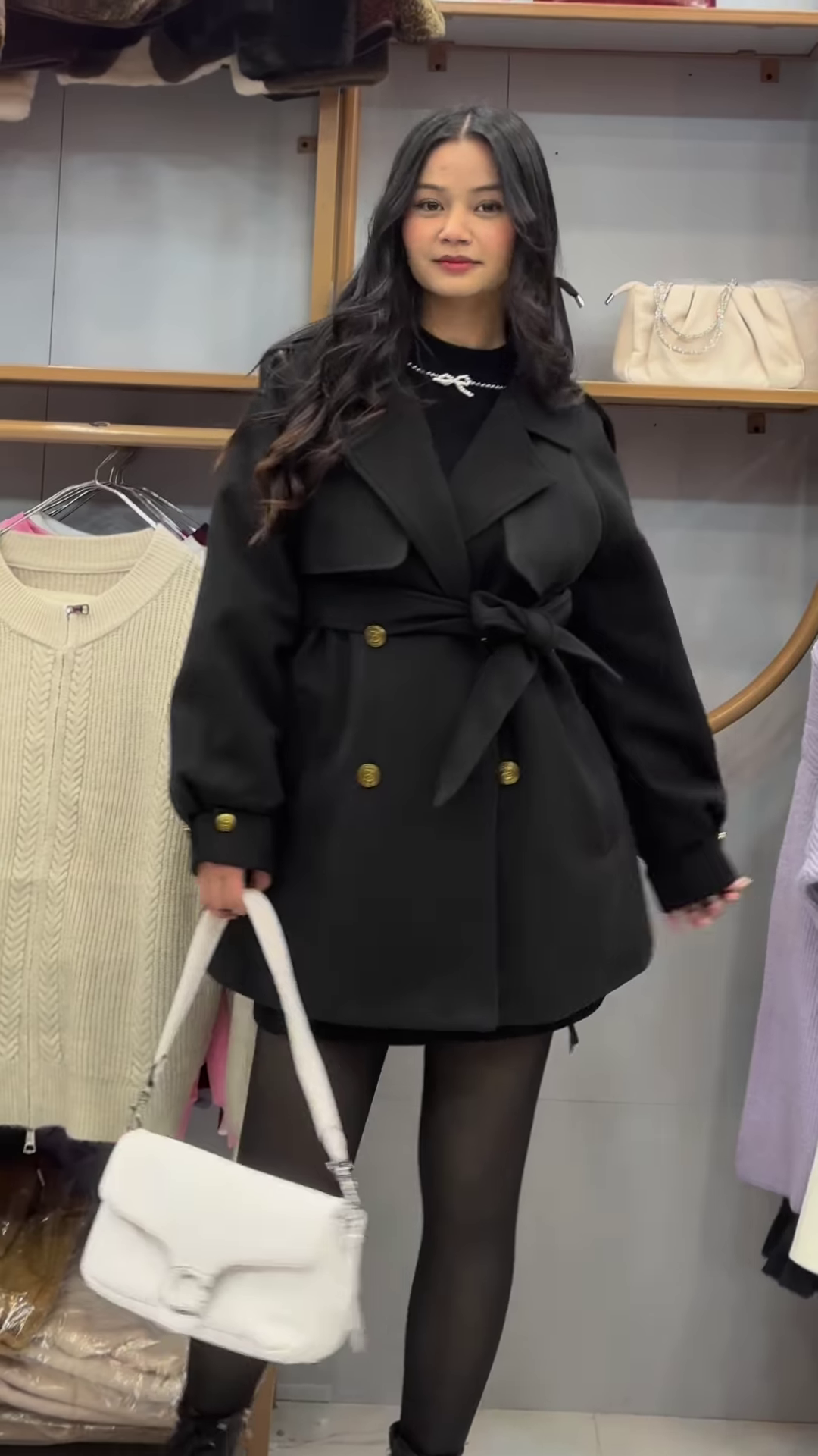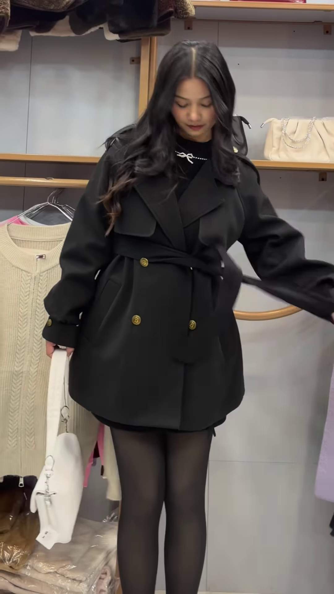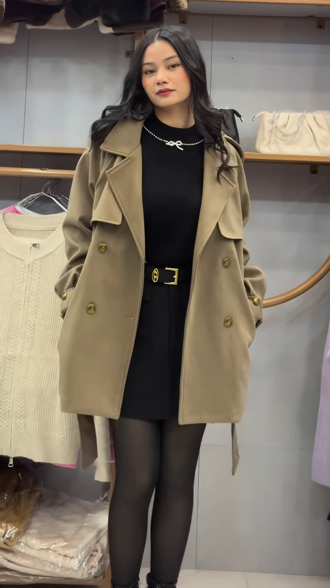 Beneath the coat lies the eternal power of black β a fitted dress that embraces minimalism while exuding allure. The dress, cinched at the waist with a sleek belt featuring a golden buckle, adds a touch of glamour and strength to the look. π€β¨ The golden accent elevates the dark base, creating a balance between subtle sophistication and radiant detail.