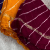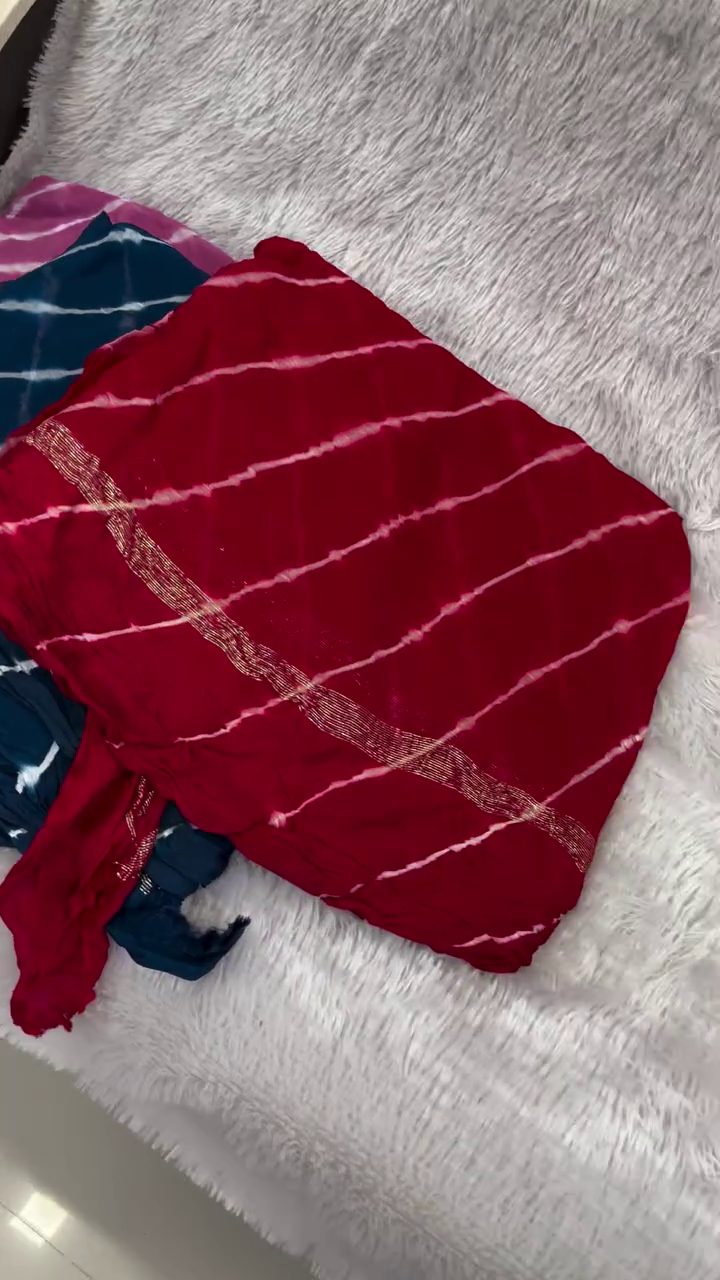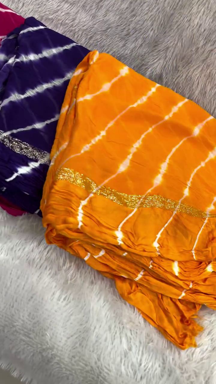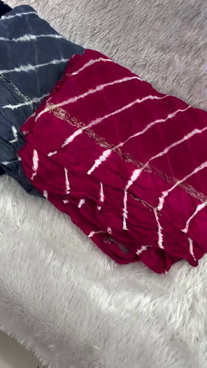 Lehariya (or Lahariya) is a traditional tie-dye technique from Rajasthan, India, characterized by its vibrant diagonal stripes that resemble waves. It is commonly created on lightweight fabrics like georgette, chiffon, or cotton, making it a popular choice for sarees, dupattas, and salwar suits.