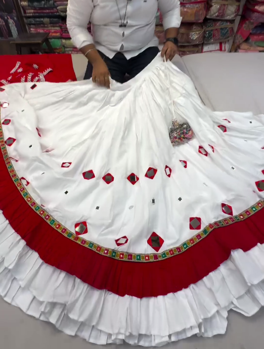 This lehenga blends traditional elegance with modern charm. The breathable cotton fabric ensures comfort, while the vibrant digital prints make it stand out effortlessly. The mirror lace border adds a touch of shimmer, making it ideal for daytime and evening celebrations alike.