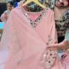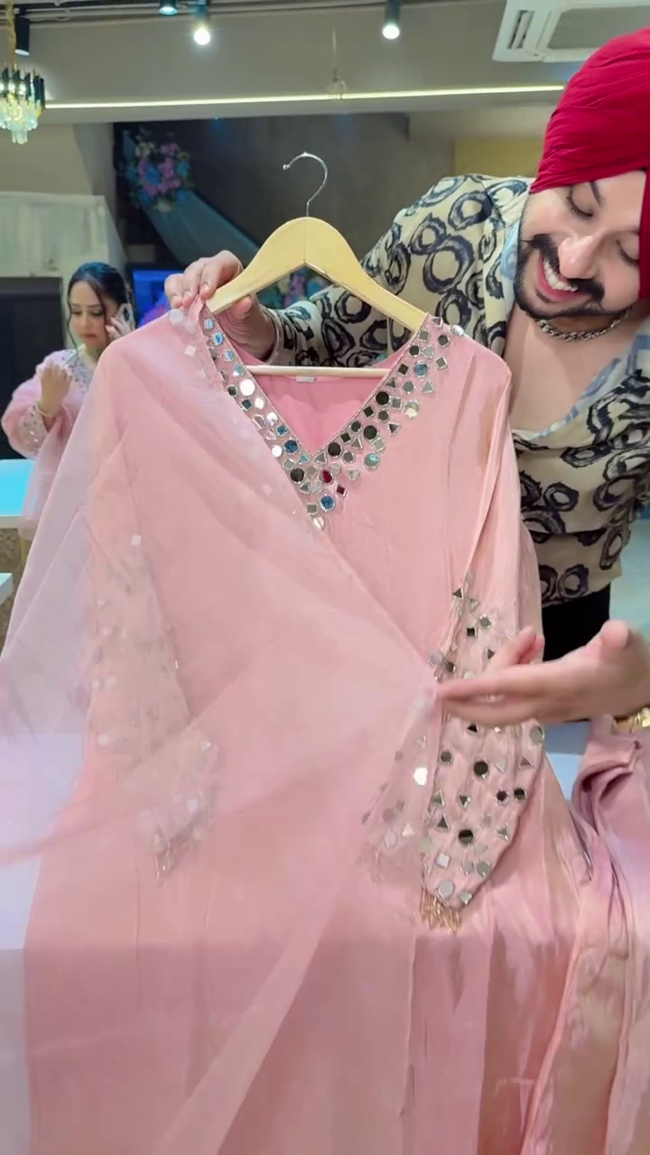 Made from premium shimmer silk fabric, this stunning suit features intricate heavy mirror work on the neckline and sleeves, creating a refined yet festive appeal. The soft pastel pink hue enhances its sophisticated charm, making it perfect for wedding functions, festive gatherings, or special evening events.